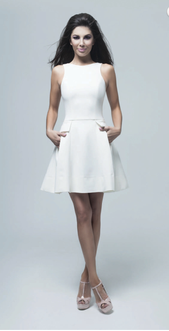 This minimal evening column in viscose jersey with keyhole back was an attest to Azadeh’s adept design hand with modern sleek silhouettes. Perfect for any event. Go understated with a sculpted ponytail, gold hoops and cuff or go black tie with crusted drop earrings, bracelets and an up-do.