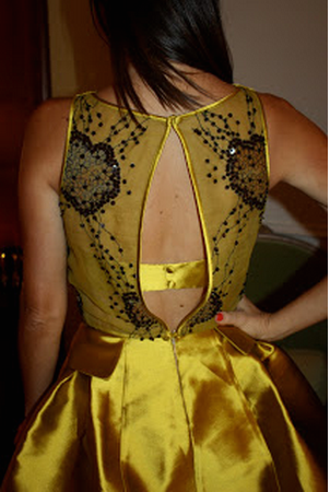 A stunning party dress in Duchess silk satin with an embellished keyhole back. A to die for statement color combination of chartreuse and black. Loved the playfulness of the full skater skirt.