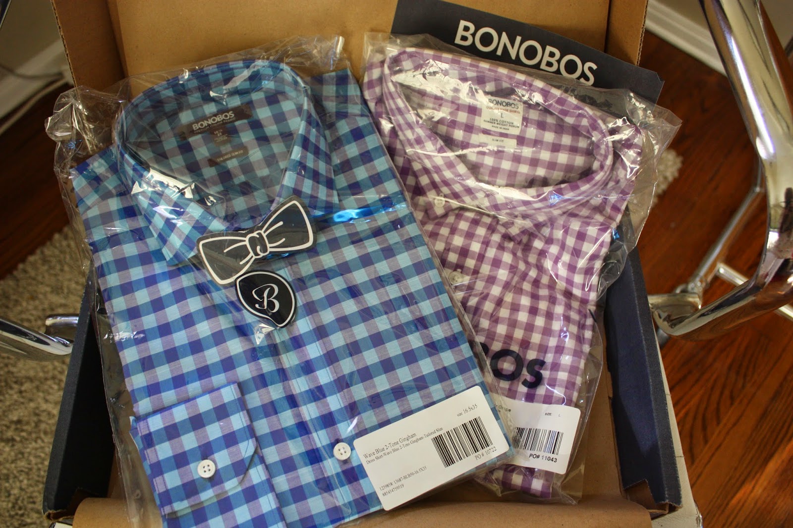 This was what was inside! The Americano Bright Blue shirt in the Tailored Slim Fit & The Purple Gingham Summer Weight shirt in the Slim Fit Check out Bonobos online or visit one of their Guideshops in 12 cities across the USA.