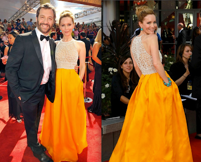 Funny, cool couple, Leslie Mann and Judd Apatow were equally sharp on the red carpet. Leslie looked effortless in her lace-bodiced, tangerine skirted dress. The turquoise baubles were a thoughtful styling addition. The pockets created a much relaxed stance when being photographed.