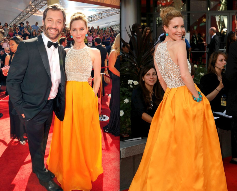 Funny, cool couple, Leslie Mann and Judd Apatow were equally sharp on the red carpet. Leslie looked effortless in her lace-bodiced, tangerine skirted dress. The turquoise baubles were a thoughtful styling addition. The pockets created a much relaxed stance when being photographed.