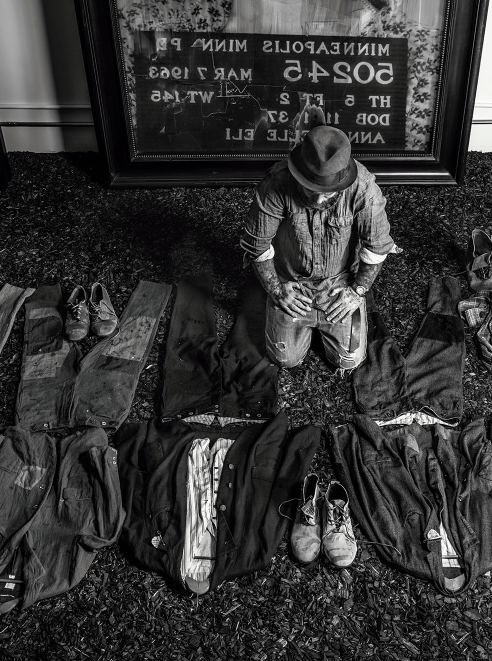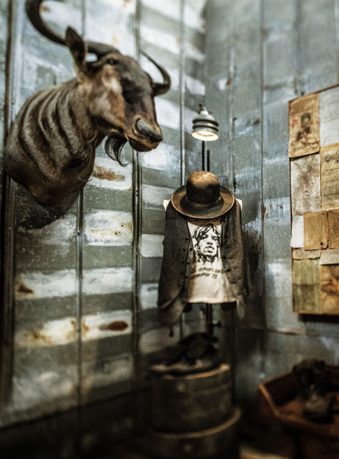 Recently, Meredith and I, visited the Madeworn studios in Hollywood. With an appointment, we gained entrance to the gated compound of 7 buildings containing Blaine Halvorson’s art, clothes and hand cobbled shoes. His craft style is referred to as homeless-chic. Every piece whether clothing, shoes, furniture or art is handmade and finished; tattered, sand blasted, stone ground or hand dyed. The space in which everything is housed is beyond words…there is a sense of pioneer woodsmen, mixed with an ancient archaeological dig, topped off with intense air of incense. We walked through the 7 buildings in total awe. Some rooms were purely art spaces, others incorporated wearables. Madeworn is best known for their distressed hand printed rocker tees (which is why we were there) which are housed in a replica of CBGB’s bathroom with urinals and all.