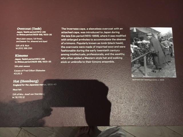 My boys loved the Japanese, Tonbi. A very fashionable coat/cape with enlarged armholes to fit kimono sleeves worn in the early 20th century. How cool that Tonbi means black hawk in Japanese. Take a look through and let me know which were your faves. I’ve included the museum label of each costume for accurate details, designers and time periods.