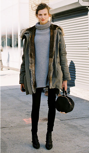 In our quest to feel stylish, we look towards the future. Yet, how often are the trends a throw back to the past. The turtleneck has come in and out of style over the past decades. It started as longshoreman sailing garb, later moved to 60’s beatnik chic- the anti shirt and tie, we then layered our whale printed t-necks under fair isles sweaters in the 80’s and did a monochromatic black t-neck and trouser head-to-toe in the 90’s. Well, the roll neck (british term) is back and larger then ever. Stylish in chunky silhouettes layered over leather, skinny denim and minis. Or in true 90’s style, it’s layered under dresses as a nod to the school-girl jumper. Although the turtle neck is a classic, it continues to be reinvented in new silhouettes and yarn. REMEMBER! To keep the look fresh, its important to style the t-neck with updated bottoms (leather), shoes (ankle boots or stilettos) and accessories (top handle bag).
